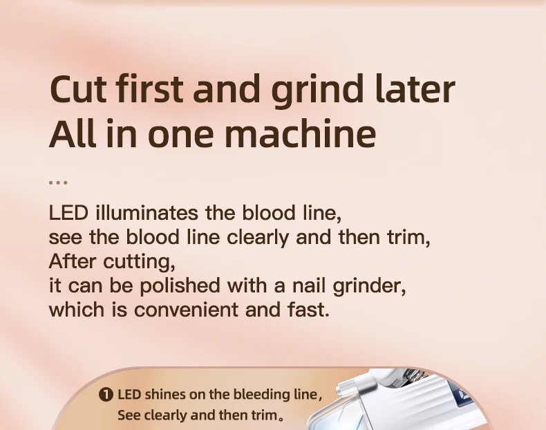 --First cut and then grind a set (LED lights up the blood line, see the blood line clearly before trimming and cutting, you can use LED lights up the nail polish remover for grinding, which is convenient and fast)